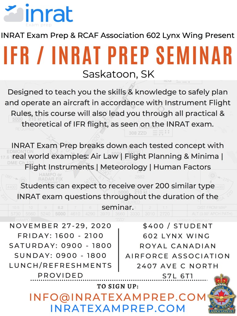 On the weekend of 27-29 Nov the RCAF Association will be hosting an IFR Exam Prep Seminar at our facility in Saskatoon.
